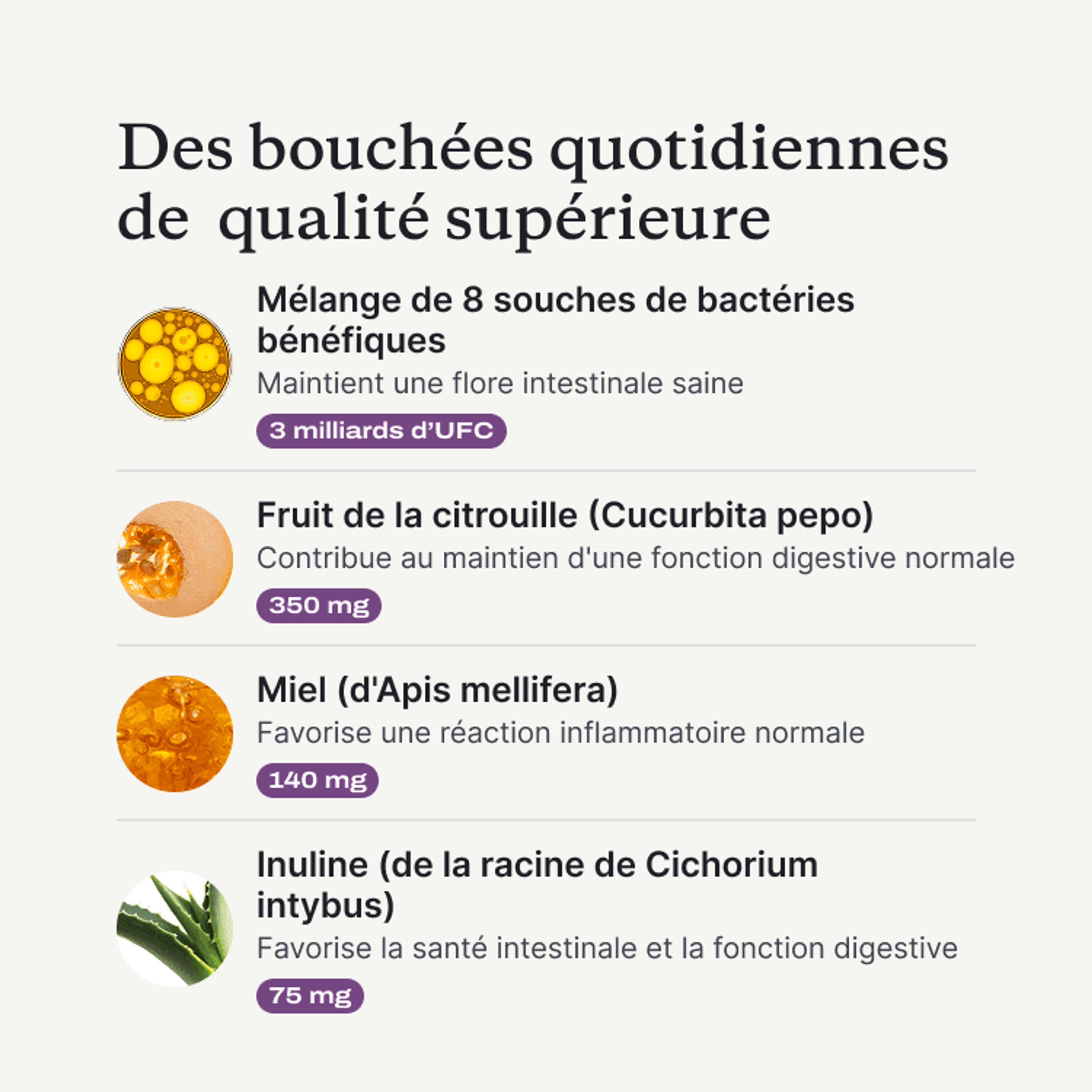 Chaque bouchée contient des bactéries bénéfiques vivantes qui favorisent la digestion, le fonctionnement du système immunitaire et le bien-être général.