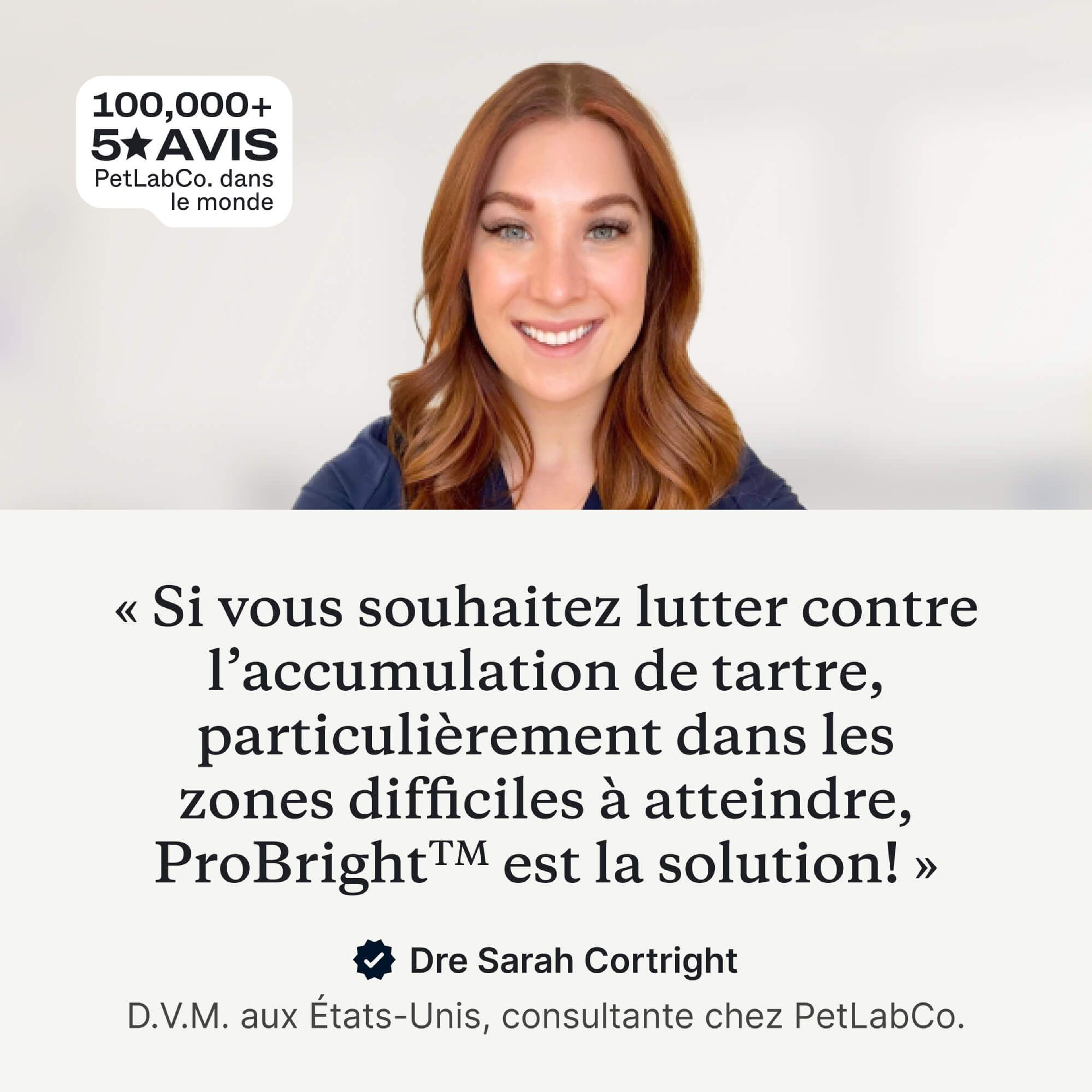 « En tant que vétérinaire, je comprends l’importance de prendre soin des dents et de l’haleine de votre chien. C’est pourquoi je recommande ProBright™. »