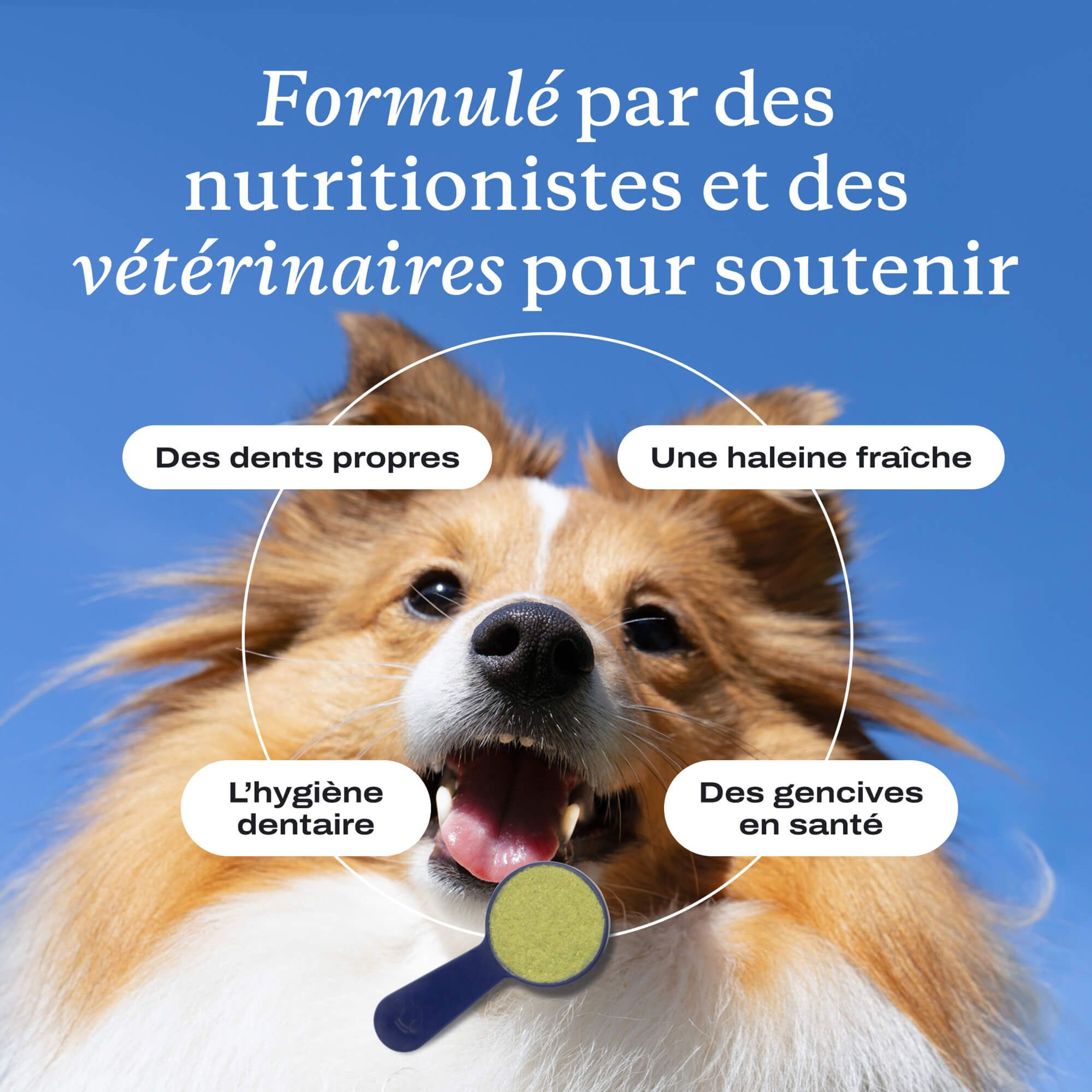 Cette algue bénéfique peut cibler le biofilm buccal et l’accumulation de tartre sur les dents de votre chien, favorisant ainsi la santé des dents et des gencives et contribuant au maintien d’une bonne hygiène buccale.