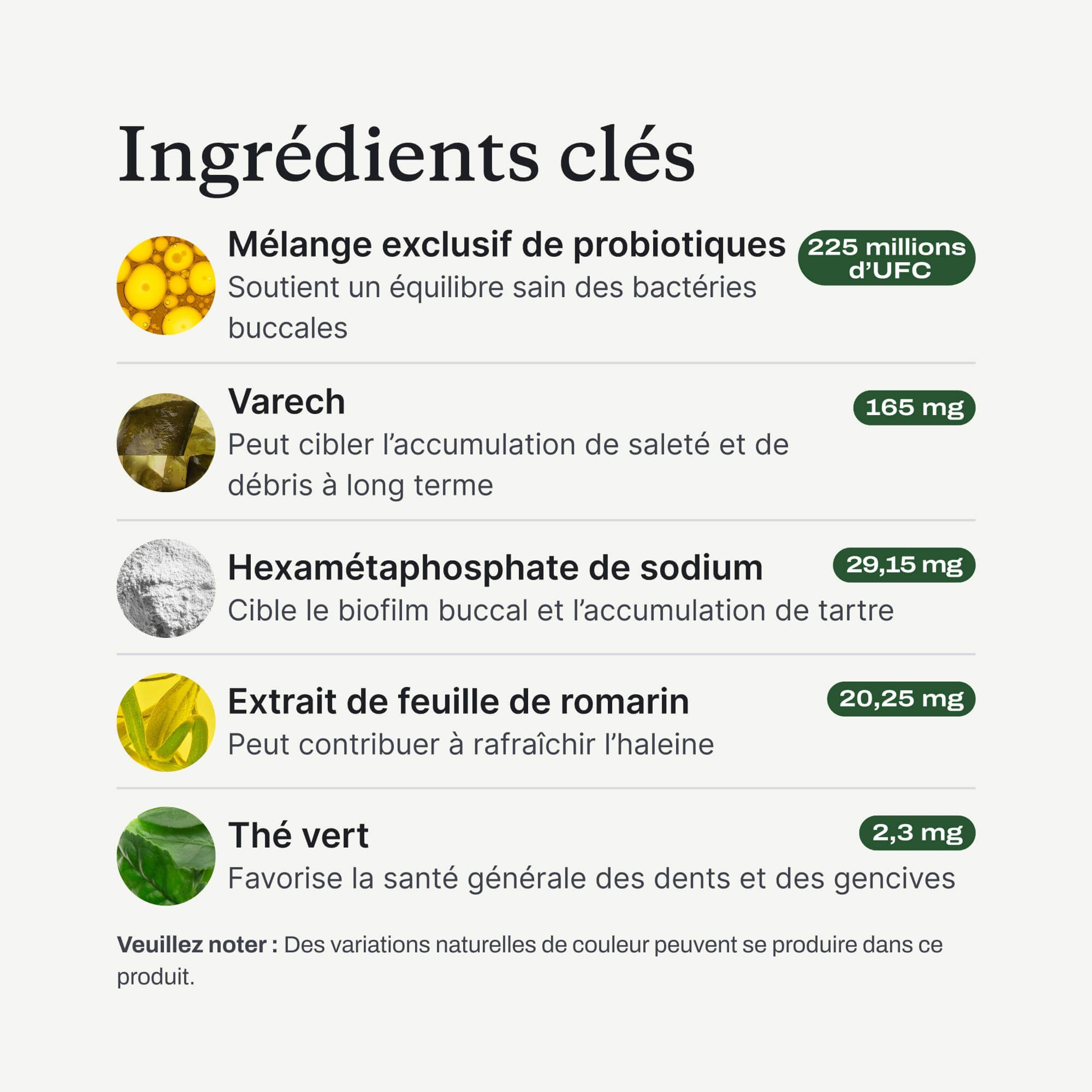 - Aide à maintenir un niveau sain de bactéries buccales