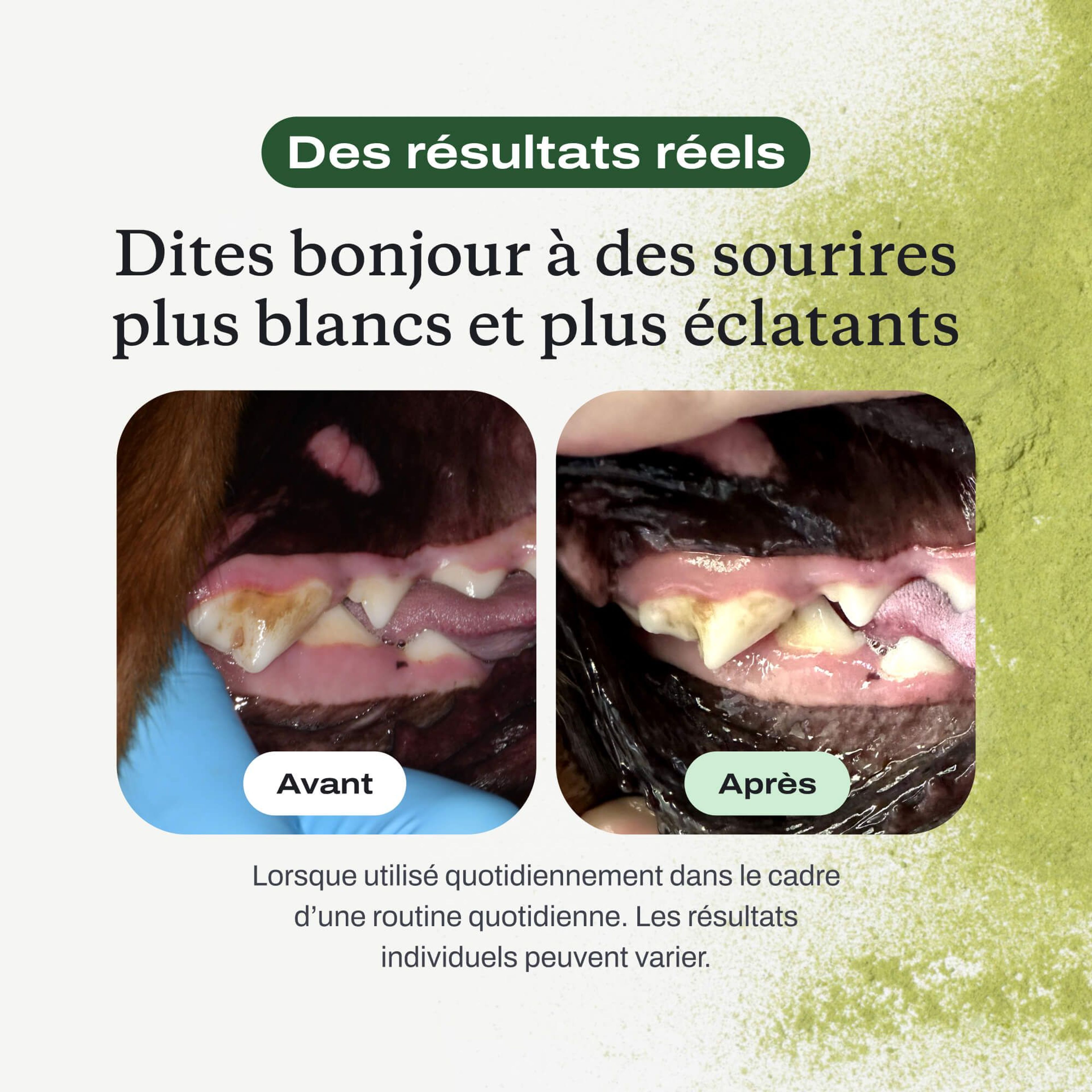 Remarquez une haleine plus fraîche et moins d’accumulation sur les dents.