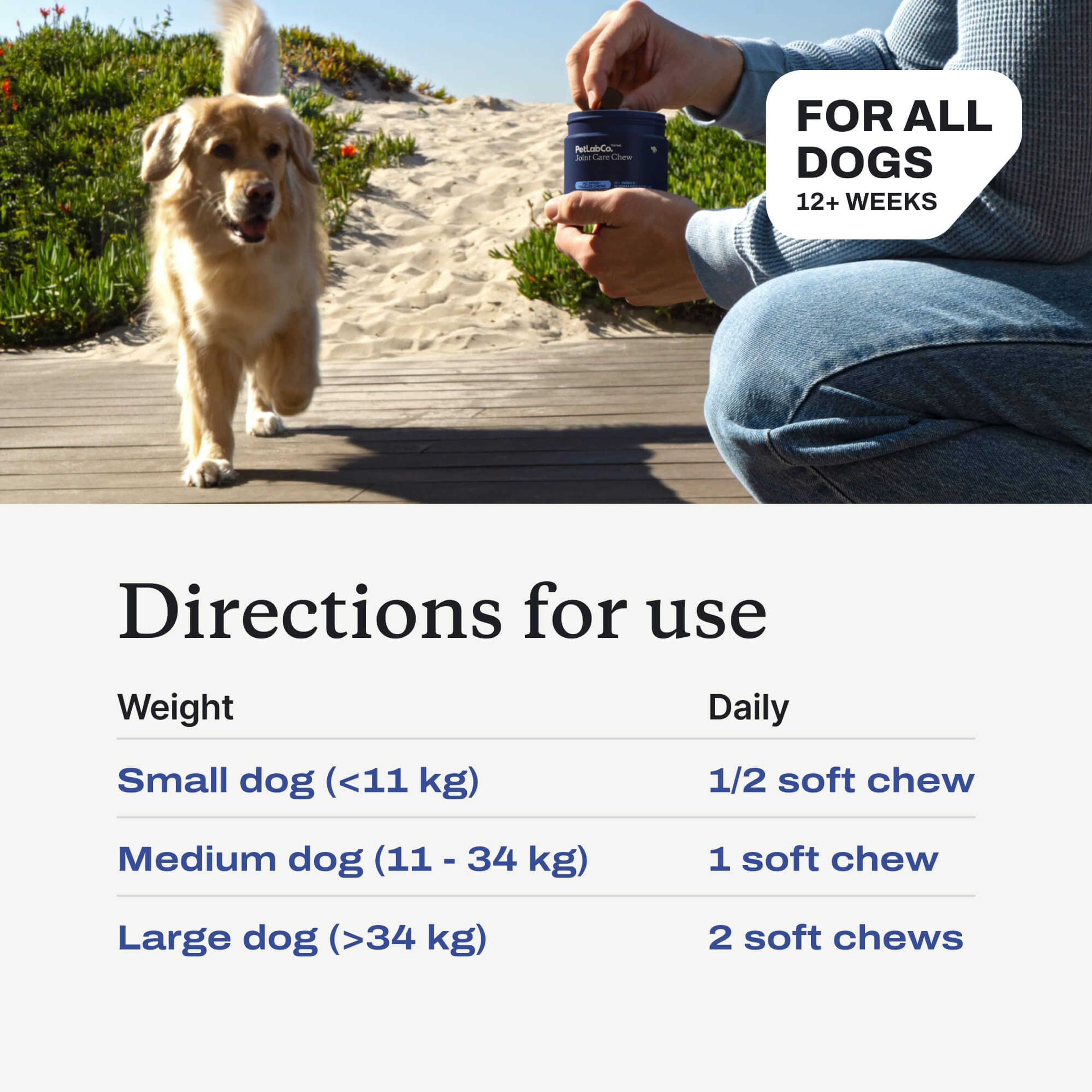Suitable for all dogs over 12 weeks, supporting joint health over time.